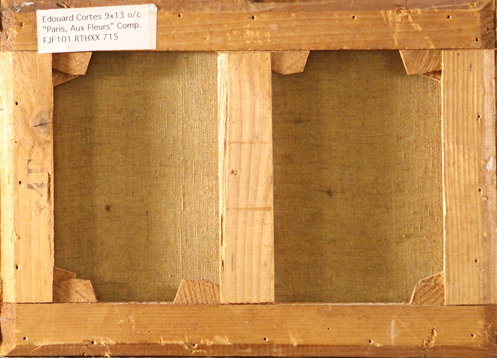 Notes: "Paris, Aux Fleurs", was painted by Edouard Cortes, circa 1930. The painting is oil on canvas, measuring 9x13 and signed lower right, Edouard Leon Cortes. The painting is in original condition with no signs of restoration.