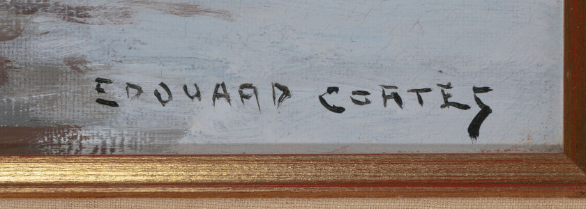 Notes: "Place du Theatre de la Comedie Francaise", was painted by Edouard Leon Cortes, circa 1950-1955. The painting is signed lower left, Edouard Cortes. Note:Original canvas; faint craquelure in snow in lower right quadrant; stable surface; small abrasion with minor paint loss in upper right corner. Label from International Galleries Chicago on verso